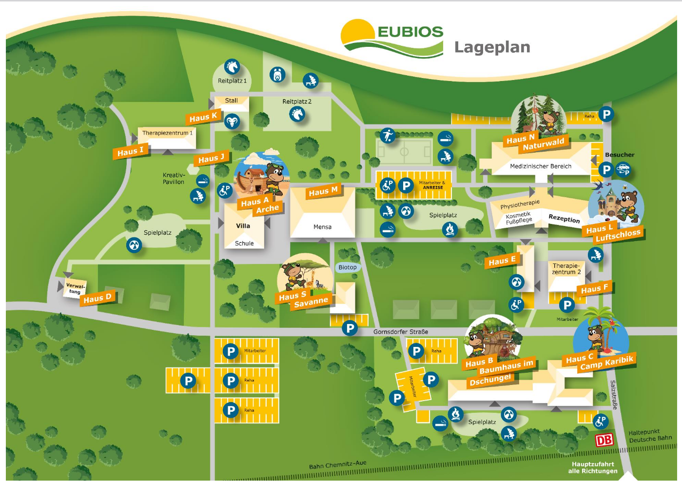 Für Familien, die mit dem PKW anreisen, stehen Parkplätze zur Verfügung. Die Benutzung der Parkplätze erfolgt auf eigene Gefahr. Für eventuell auftretende Schäden übernimmt die Reha-Fachklinik EUBIOS keine Haftung.